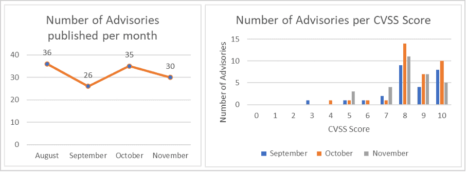 In total, those two months comprise a total of 65 advisories, with an average CVSS score of 8.2 and an average number of 2.5 CVEs per advisory. The graphs below illustrate the evolution over the last few months: