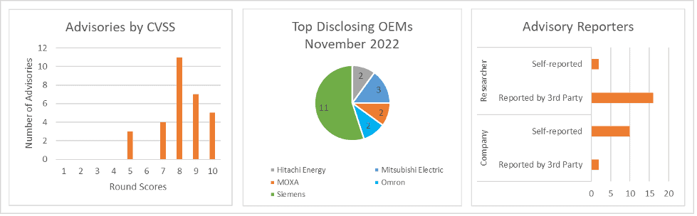 November, on the other hand, was a slightly quieter month when it comes to CISA advisories. The month still welcomed cybersecurity events such as the National Computer Security Day on November 30th. During the month of November, Verve’s team analyzed a total of 30 new ICS advisories. From those advisories, Verve observed the following data points: